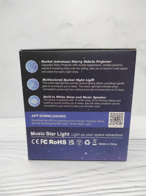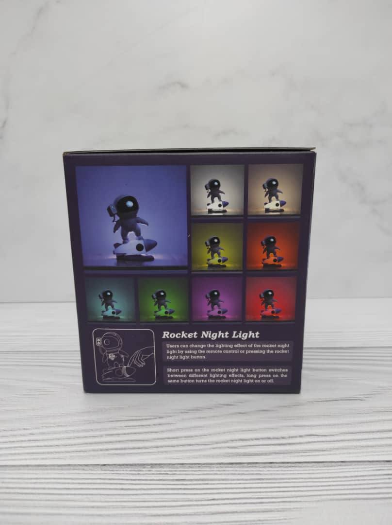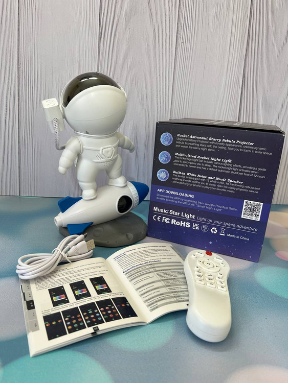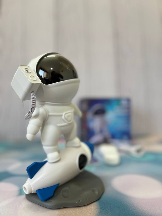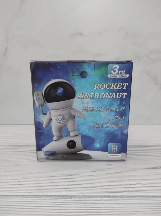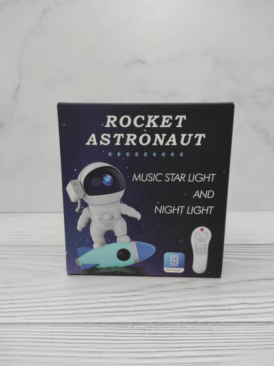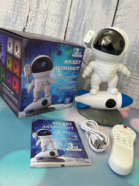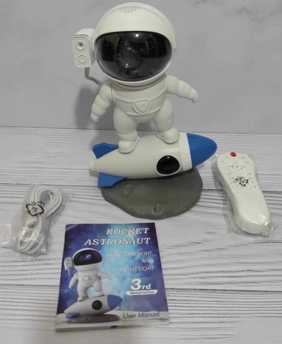 فضانورد موشک سوار یک چراغ خواب با قابلیت پخش افکت تصویر کهکشانی بر روی سقف و دیوار اتاق است که به همراه افکت لیزر ستاره ای حس یک سفر کهکشانی را قبل از خواب به شما میدهد . تلفیق همزمان تصویر زنده کهکشانی و لیزر ستاره ای جذابیت اتاق خواب شما را چندین برابر میکند . این محصول دارای ریموت کنترل نیز می باشد که میتواند نور پرژکتور یا لیزر را کم یا زیاد و یا برای روشن ماندن محصول تایمر تعریف کنید . برای روشن کردن این محصول باید از آداپتور موبایل استفاده کنید و از طریق کابل داخل بسته بندی آن را شارژ نمایید.